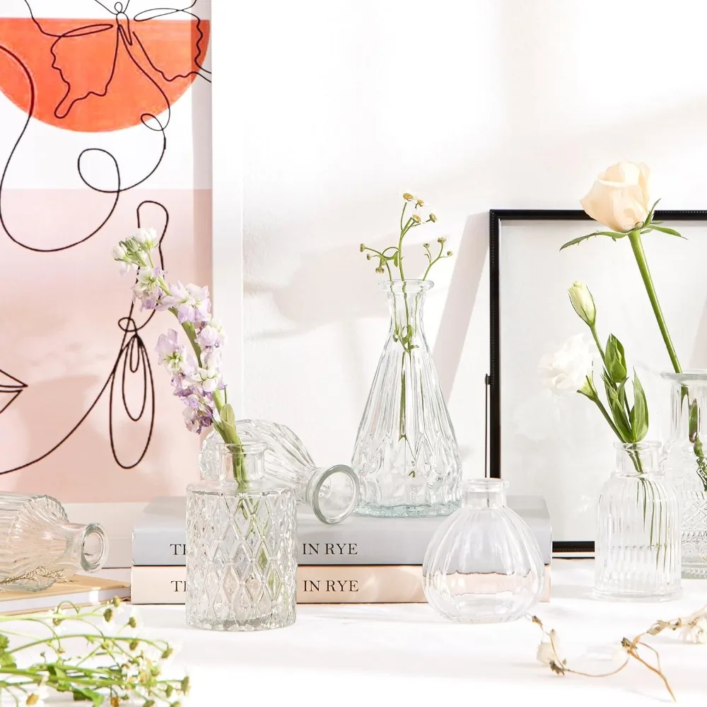 - 【Multifunctional】Clear glass vases can be used for fresh flowers, silk flowers, dried flowers, greenery, branches, feathers, or other decorations. Fill vintage glasses with essential oils and reed diffusers to enjoy your favorite fragrance. You can also use them as candle holders. Mini bud vases can be the centerpiece on your dining table, in your living room, bedroom, kitchen, bathroom, office, or windowsill. Make great centerpieces for restaurant tables, weddings, Partys,and other events.